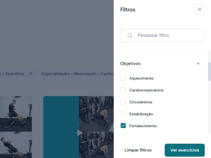 📌 Os filtros de musculação separados por aparelhos, cardio e peso livre são especialmente úteis para adequar treinos conforme os equipamentos disponíveis.