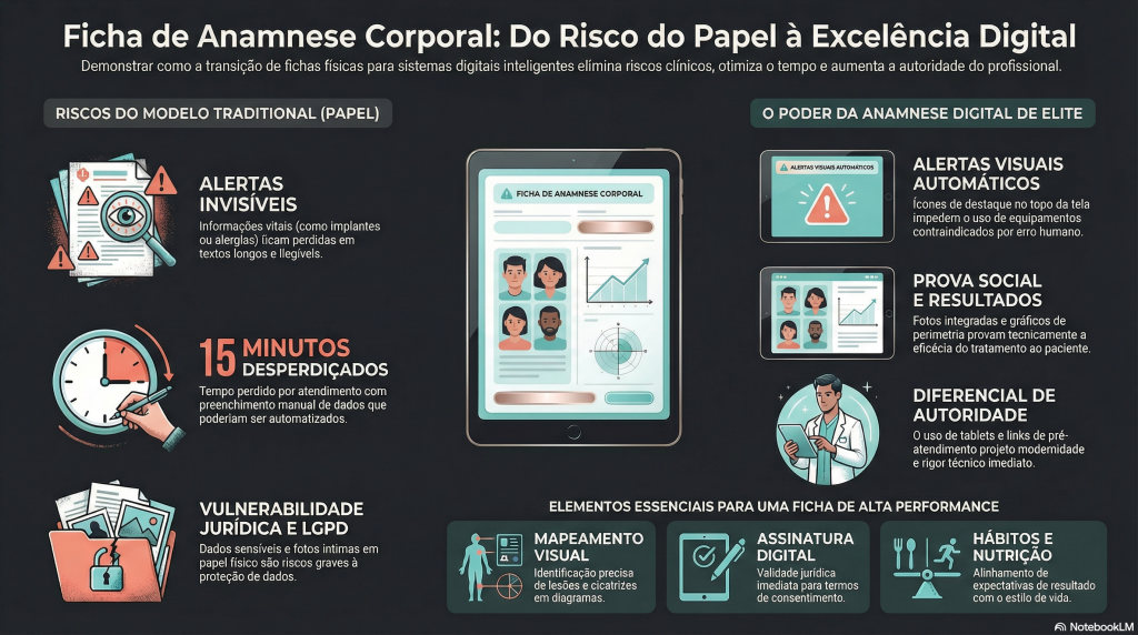 - Risco jurídico e LGPD: deixar uma ficha de anamnese corporal com dados sensíveis (como fotos íntimas e histórico médico) em cima de um balcão ou em arquivos físicos sem tranca é uma violação direta da Lei Geral de Proteção de Dados.