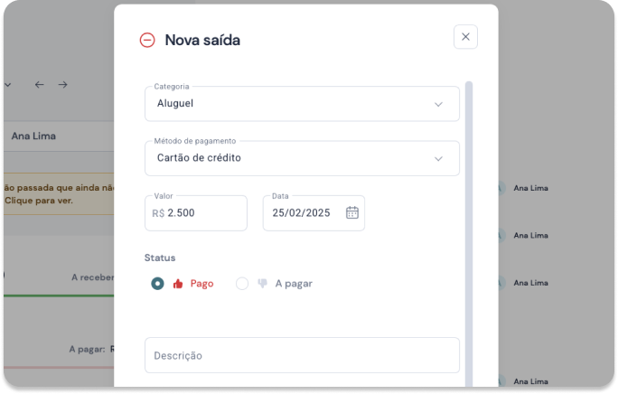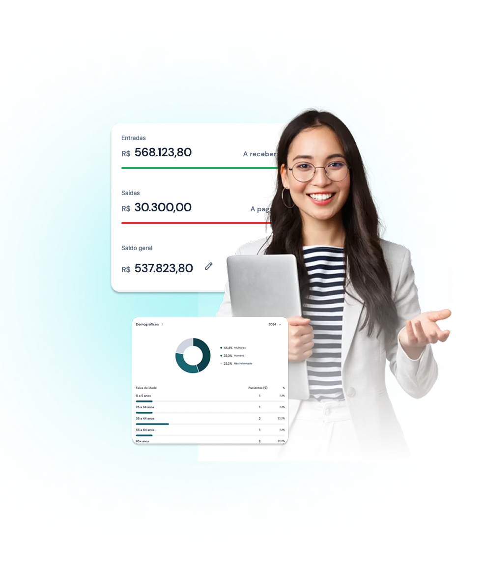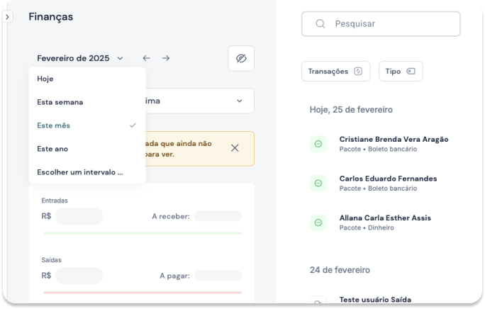Tenha receitas, despesas e repasses organizados automaticamente e use métricas para validar ou ajustar sua rotina.